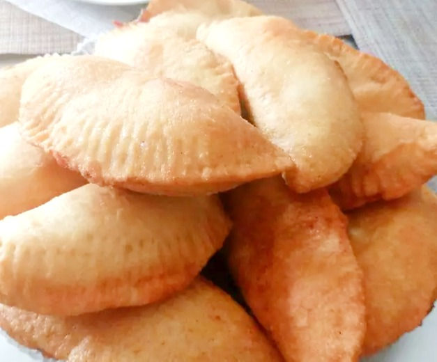 Your individual dough balls should have risen. Roll out each ball into a circle. Add a spoonful of filling. Fold over. Seal fold with a fork and a sprinkle of water using a pastry brush. Finish all ingredients.